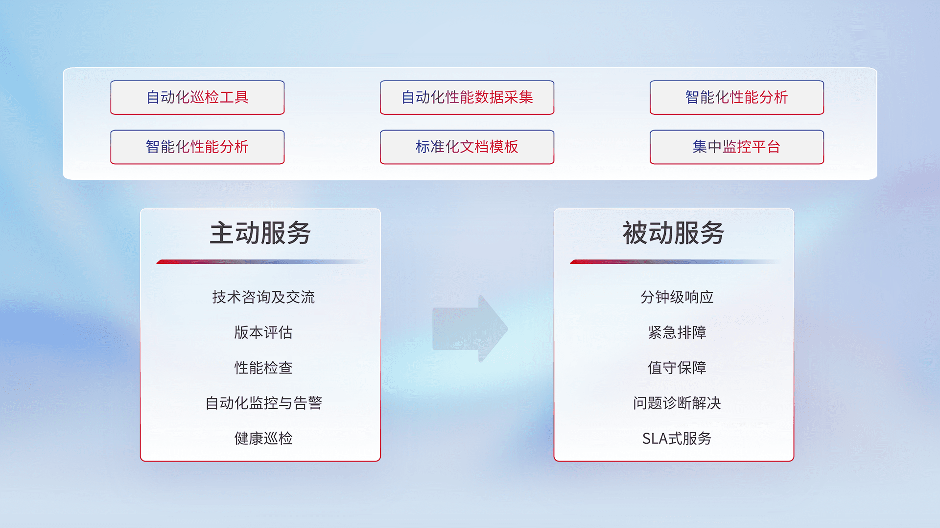 智能化工具和标准化文档,,,,保障服务质量,,,提供主动服务(包含技术咨询、、版本评估、、、、性能检查、、、、自动化监控与告警、、健康巡检)和被动服务包含(分钟级响应、、、紧急排障、、、值守保障、、、、问题诊断解决、、、SLA服务)。。
