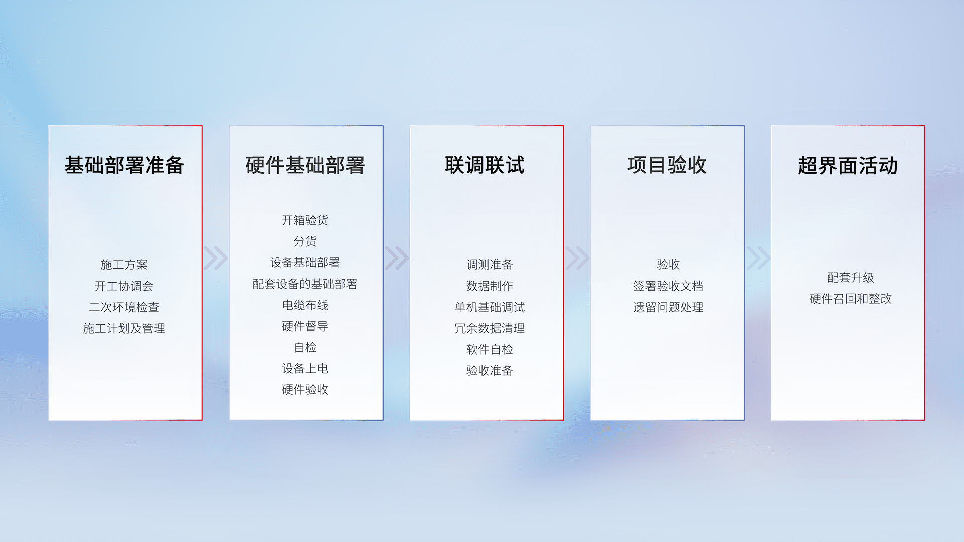 从基础部署准备、、硬件基础部署、、、联调联试、、、项目验收、、越界面活动的全过程可追溯,,保证施工质量和进度。。